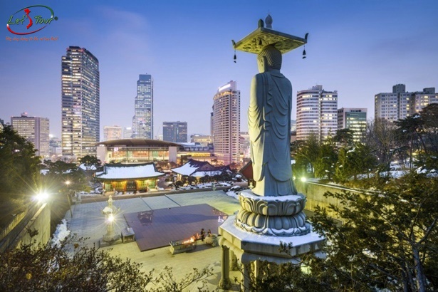 Chiều: Đoàn tham quan Thác nước Cheonjiyeon. Theo truyền thuyết, đây là nơi các tiên nữ dạo chợi khi xuống trần. Thăm Vách đá Jusan-Cheonli, dâng hương tại chùa Yakcheonsa –  một trong những ngôi chùa trang nghiêm hiện đại nhất của Phật giáo Châu Á với kiến trúc mỹ thuật tuyệt đẹp.