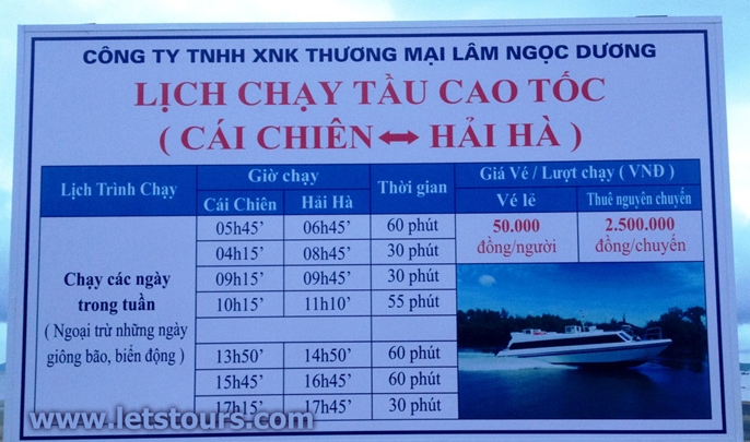 Phà Hải Hà đi Cái Chiên có các chuyến theo hình ảnh dưới đây, bạn nên lưu ý để đến đó kịp giờ. Vé qua phà cho người đi bộ là 20.000đ/khách. Lưu ý: nếu đi xe khách thì chỉ xe từ 4 – 16 chỗ là qua được phà, các xe to hơn không qua được phà.
