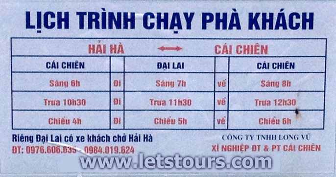 + Ngày đi: Bạn nên đi xe giường nằm các chuyến buổi tối tuyến Hà Nội – Móng Cái, thời gian cụ thể các chuyến xe bạn vui lòng liên hệ với nhà xe Kalong tại các bến Mỹ Đình, Lương Yên, Gia Lâm, Giáp Bát giá vé trung bình 200.000đ/khách/lượt. Nên đi các chuyến chạy vào thời gian từ 20h30 hoặc muộn hơn để đến Hải Hà tầm từ 4h00 – 5h00 sáng. Bạn nói nhà xe cho xuống Hải Hà để sang Cái Chiên: cụ thể có các điểm xuống như Ngã 3 Cây Đa, Ngã tư Ngân hàng.