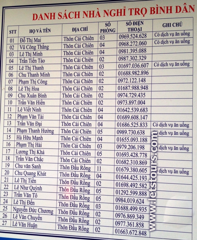 Nhà trọ: Về thông tin nhà trọ thì du khách lưu lại trong ảnh dưới đây đã tương đối đầy đủ. Mình chỉ nói qua về mức giá: Nhà trọ ở đây ngày thường thì giá từ 200.000đ (phòng không điều hoà) đến 400.000đ/phòng/đêm (phòng đẹp có điều hoà). Cuối tuần thì giá từ 300.000đ (phòng không điều hoà) đến 500.000đ (phòng đẹp có điều hoà). Một phòng ở được từ 2 đến 4 người.